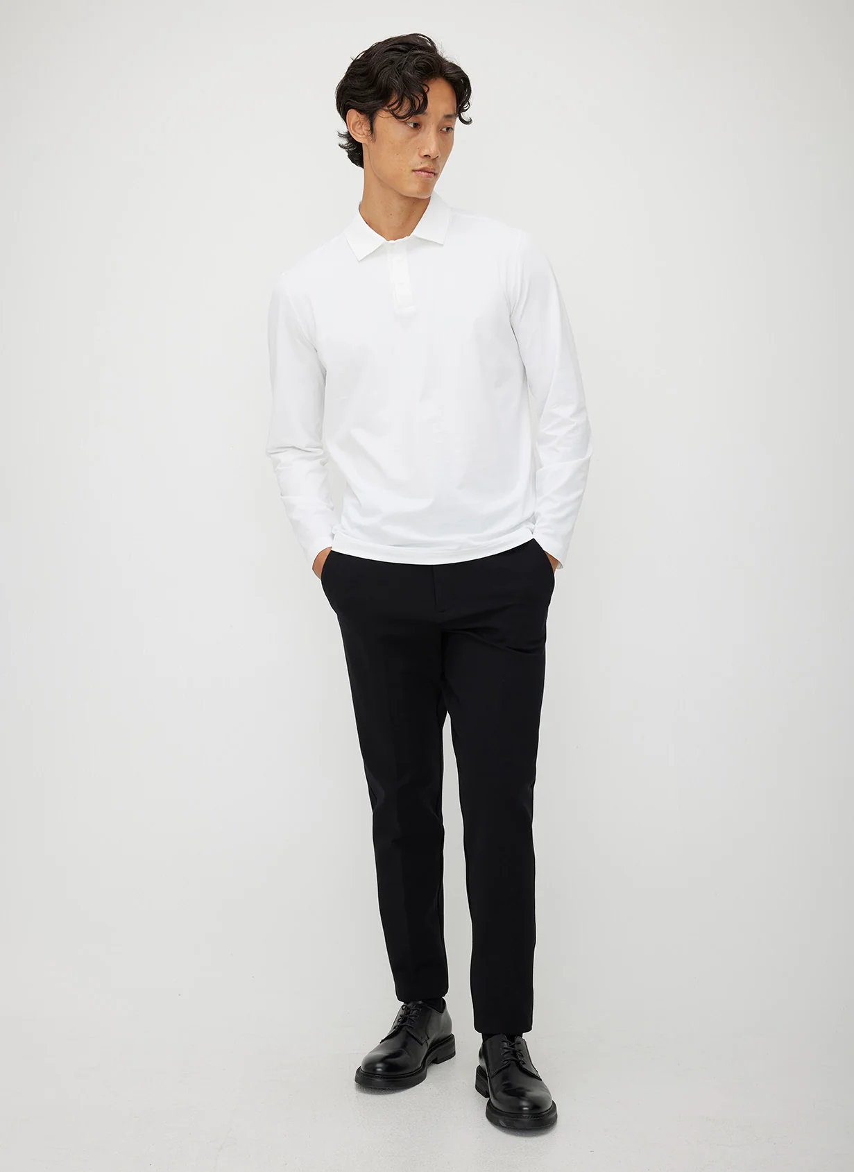 A classic men's long sleeve polo with a technical upgrade. The breathable, lightweight cotton blend Micro Pique fabric offers four-way stretch for unmatched flexibility. A three-snap bonded placket and collar keep you looking sleek even under layers. Designed for modern lifestyles, this polo withstands rigorous daily routines, keeping you comfortable from sun up to sundown.