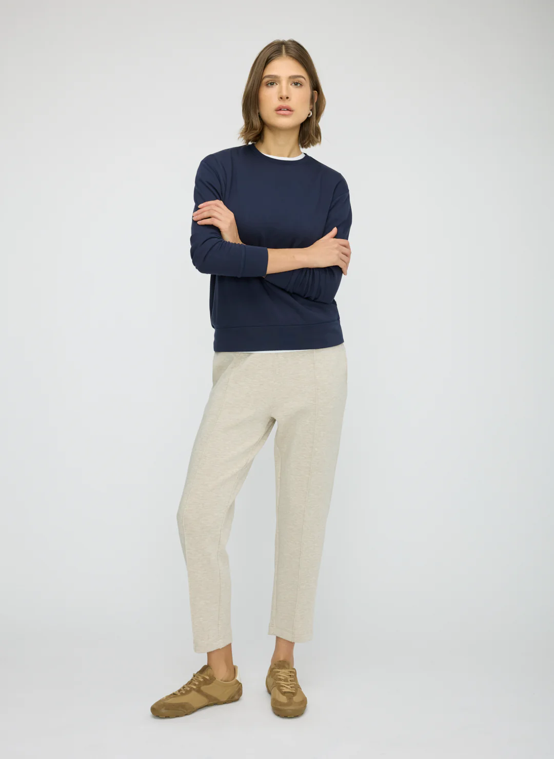 A women's long sleeve crewneck so classic, you’ll find yourself reaching for it 24/7. With details that last, like zigzag topstitching, reinforced seams, and four-way stretch, this warm and cozy brushed-feel pullover is a wardrobe staple designed to keep up to the demands of your day. Sure to be the softest staple in your closet, this is one crewneck you’ll be wearing around the clock.